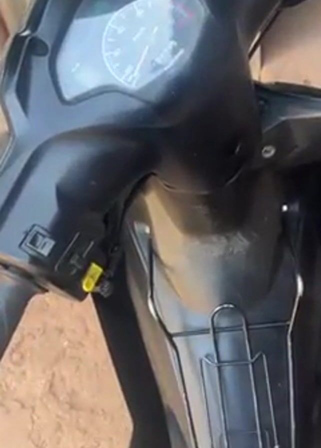 front of a black scooter. The scooter has a speedometer with visible kilometer per hour markings. The handlebars and mirrors are visible. The scooter is parked on a reddish-brown, potentially earthen, surface. A corrugated metal wall is partially visible in the background. The overall scene is shot from a slightly high angle, focusing on the front section of the scooter.