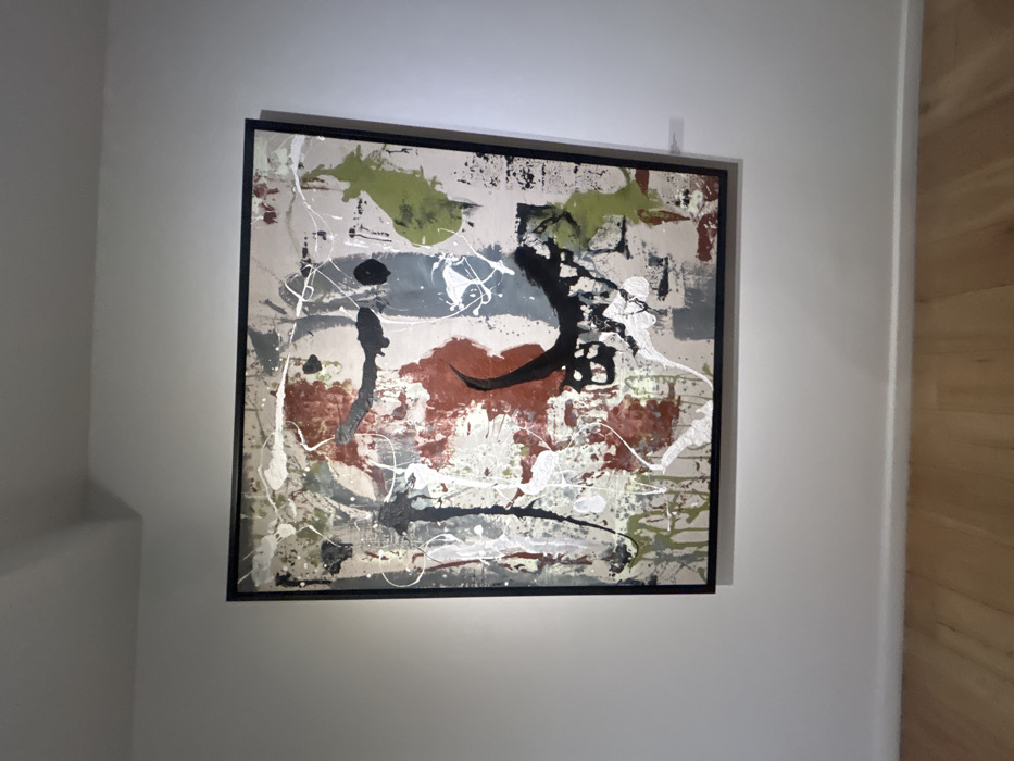 Abstract painting in a black frame hangs on a light gray wall. The artwork has a predominantly neutral palette with splashes of green, red, gray, and black. Chaotic white streaks and splatters overlay the background, creating a sense of movement. Dominant black strokes evoke the feel of calligraphy. A bright light source illuminates the painting from below, causing a gentle gradient of light. A hint of wooden flooring is visible on the right.