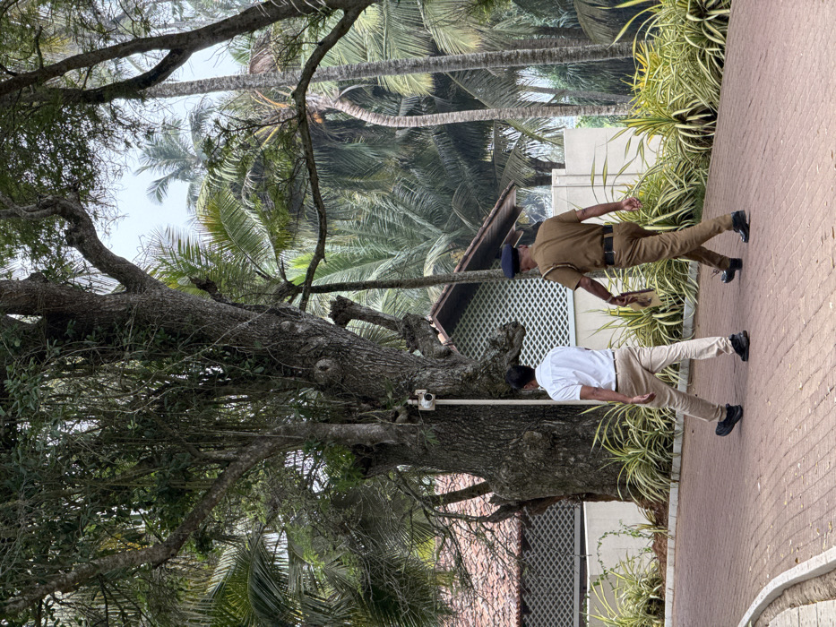 A sidewalk next to a brick walkway is bordered by lush greenery, including palm trees. Two men stroll along the path. The first man wears a light-colored shirt and pants. The second is dressed in a tan uniform with a blue hat, possibly a security guard. A large, gnarled tree stands nearby.