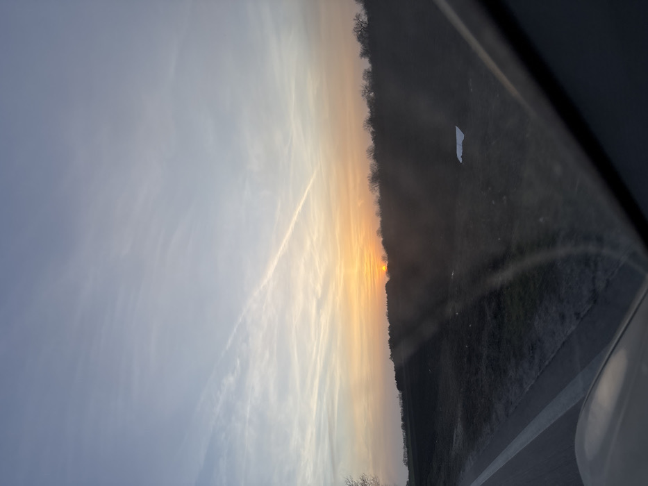 The image depicts a rural landscape near Ravnets, Bulgaria, during either sunrise or sunset, observed from the interior of a vehicle. The sky occupies the upper two-thirds of the frame, transitioning from light blue at the zenith to an orange-yellow hue at the horizon, marked by faint cirrus clouds and a distinct white contrail extending diagonally from upper left to lower right. The sun, a bright orange, partially obscured disk, is situated just above the horizon, slightly left of the image center. A dense, dark line of trees forms the immediate horizon. Below the trees, an expanse of dark, open ground, possibly a field, stretches towards the foreground. A single white, rectangular object lies on this dark ground in the middle-right distance. The lower left foreground shows a paved road surface with a solid white line and a dashed white line. Elements of the vehicle's interior are visible in the foreground: a light gray/beige hood or dashboard on the lower left and a dark structural trim angled upwards from the lower right. The view through the windshield is characterized by internal reflections and vertical light streaks across the central and right portions of the frame. No individuals, animals, or direct interactions are discernible within the scene.