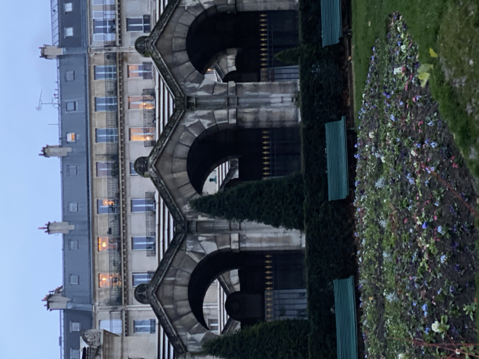 An ornate stone structure with arched openings faces a building with many windows, some illuminated. A green hedge and manicured trees are between the structure and a flower bed with purple and white blossoms. Green benches sit along the hedge. The image is vertical.