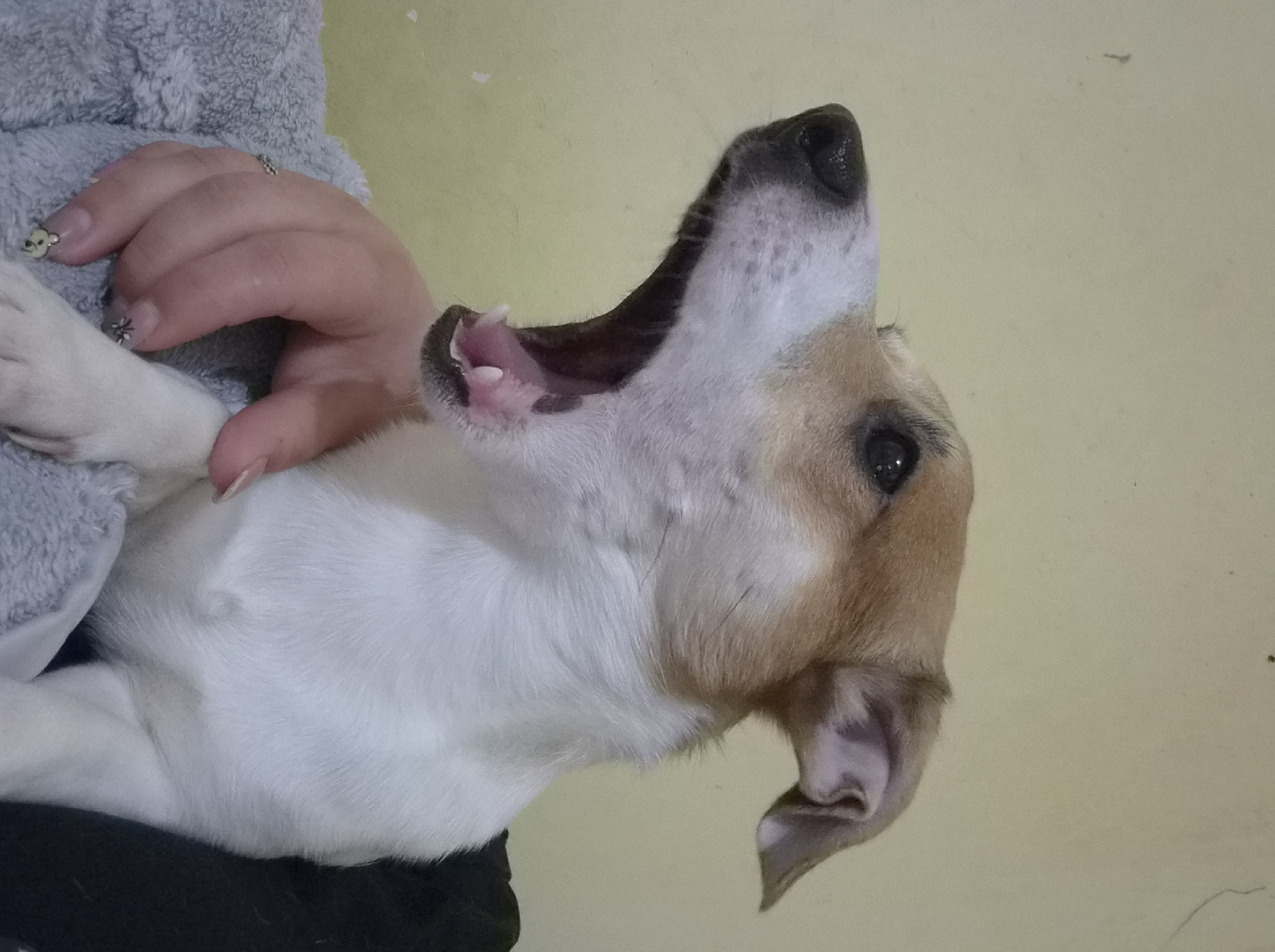 A Jack Russell Terrier-type dog, predominantly white with light brown markings on its head and ears, is depicted in a close-up profile view, facing left, captured mid-yawn. Its mouth is wide open, exposing pink gums, white canine teeth, and incisors. Its dark eyes are open. A human's left hand, with light skin tone and manicured fingernails featuring decorative elements including small dark floral patterns and a light-colored bead, is positioned beneath the dog's chin and neck area, appearing to cradle or support the animal. A silver-toned ring with a small embellishment is present on one of the human's fingers. The dog and hand rest on a gray, textured blanket or towel. A dark, solid-colored fabric is visible behind the dog's lower torso. The background is a plain, light yellow wall exhibiting minor surface imperfections. The location in the city of Plovdiv, Bulgaria, cannot be determined from the visual information presented in the image.