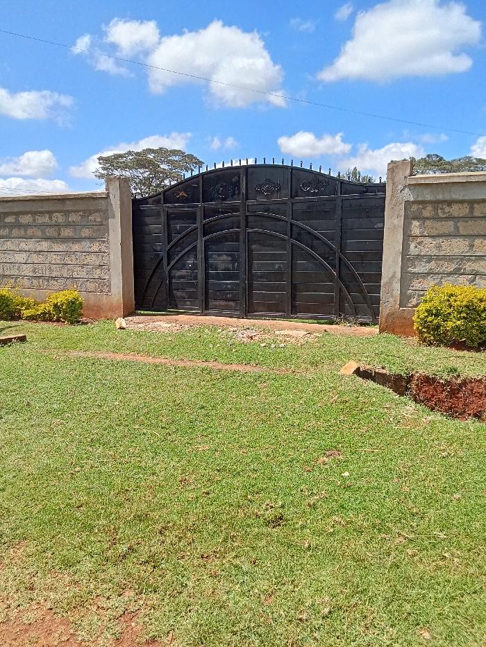 The image displays an exterior scene in Nyeri, Kenya, featuring a substantial dark-colored metal gate serving as a property entrance