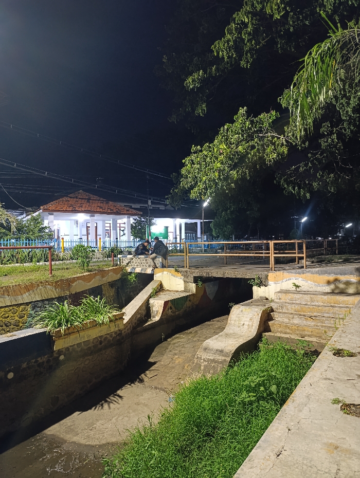 concrete drainage ditch at night in Kecamatan Panji, Indonesia (latitude: -7.697, longitude: 114.032). The ditch is lined with concrete and has a bridge over it. The bridge is made of concrete and has a railing. The ditch is partially filled with water. The ditch is surrounded by greenery and concrete. Two figures are sitting on a step near the edge of the ditch. The image was taken at night and is lit by a few streetlights. The building in the distance is lit with bright light. The building in the background is a public building. The building has a tiled roof and windows. The building has a light on at the top and appears to be open for business. There is a large, green bush in the foreground, near the ditch, and there is a white light pole in the background. There are wires strung across the image in the background. The image was taken at night.