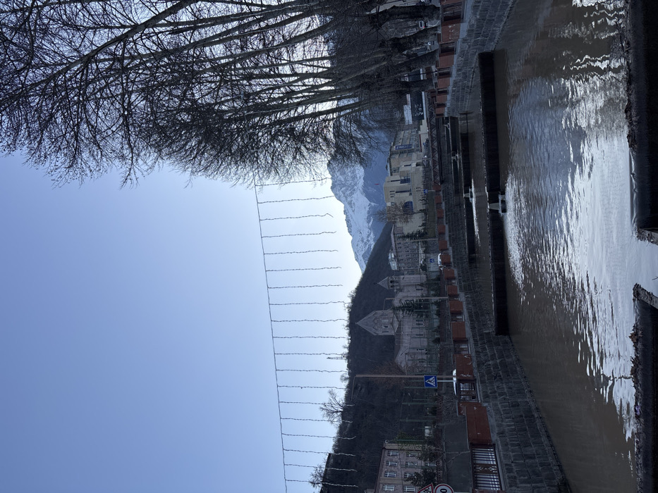 This image captures a wide outdoor view of the city of Kapan, Armenia, specifically featuring the multi-tiered canal system and surrounding urban landscape with mountains in the background. In the foreground, a multi-level concrete and stone canal flows from right to left, containing murky, brown water with visible ripples and small cascades over several horizontal weirs. The canal walls are constructed from dark, textured blocks. Overhead, a string of unlit white decorative lights hangs horizontally across the upper mid-ground. The midground features a paved area or road running parallel to the canal. On the left, a portion of a multi-story building with a light facade is visible, along with a circular "40" speed limit sign and a blue pedestrian crossing sign. Dominating the center-left is the Surp Mesrop Mashtots Church (Kapan Church), a prominent stone building with a traditional Armenian architectural style, including a central dome and two spires. It is situated on the lower slope of a dark, tree-covered hill. To the right of the church, other urban buildings are visible, including a larger, modern structure with light-colored walls and dark windows. A row of tall, bare deciduous trees with dark trunks and branches lines the right side of the frame, extending upwards towards the sky. The background consists of imposing snow-capped mountains under a clear, bright blue sky. The upper portions of these mountains are distinctly white with snow, contrasting with the darker, bare hills immediately behind the city structures. No individuals are discernible within the frame, and no specific actions or interactions are depicted. The overall environment suggests a clear day, likely during winter or early spring given the bare trees and snow.
