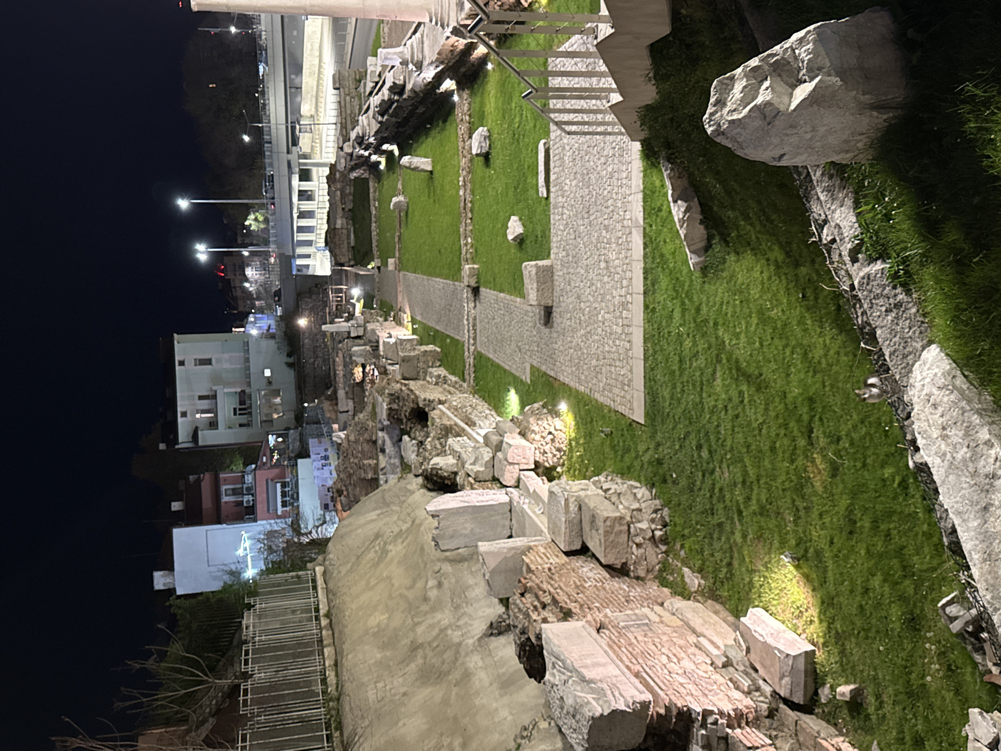Ancient ruins line a grassy area at night. Stone structures are visible on both sides of a cobbled path. Modern buildings and streetlights can be seen in the background. Large stone blocks are scattered along the edges, with some integrated into the ruin walls. The scene is illuminated by artificial lighting, highlighting the textures of the stone and grass. A metal railing is visible on the left side of the path.