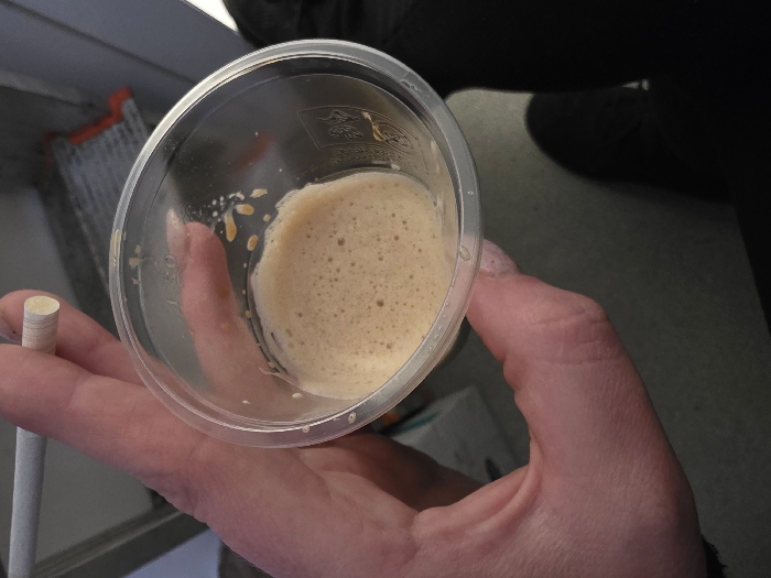 - "A human left hand, with visible skin creases and faint light pink nail polish, holds a transparent plastic cup containing approximately 100-150 ml of a light brown, foamy beverage" by FM-pHeG42, licensed under CC BY 4.0