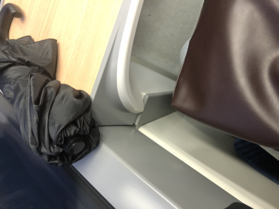 - "An umbrella, collapsed and black, sits on a light wood surface next to a curved white partition" by FM-vXe4F3, licensed under CC BY 4.0
