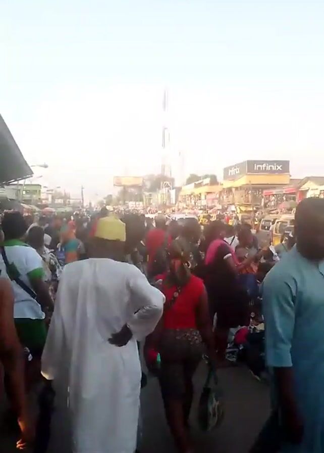 A crowd of people is milling about on a street, some of whom are walking in the same direction as the camera. There are shops and stalls lining the street, and a sign for "Infinix" is visible in the distance. The scene appears to be a busy marketplace or shopping area.