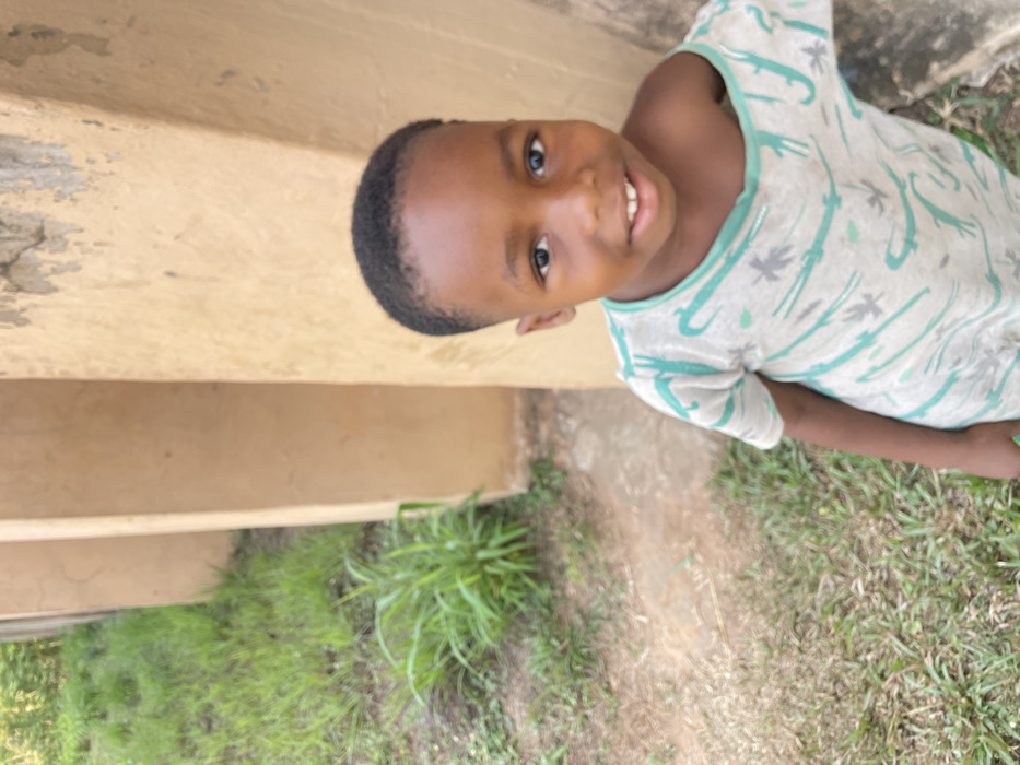 The image depicts a young child, appearing male, with dark skin and short, dark hair, positioned slightly right of center in the foreground