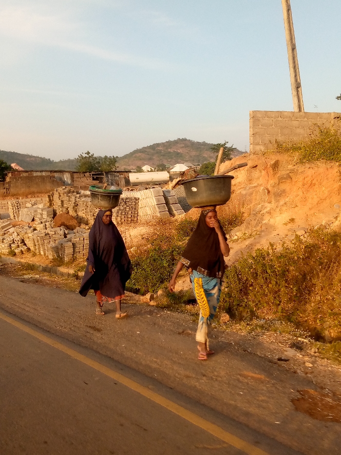 - "Two women walk along the side of a road carrying large basins on their heads" by FM-3HFVD3, licensed under CC BY 4.0