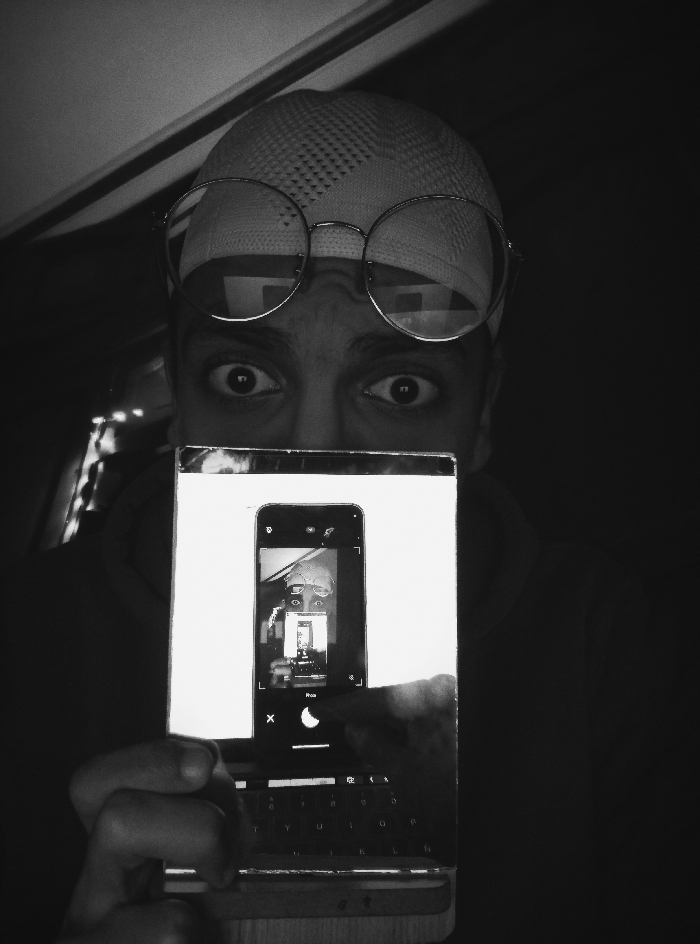 A black and white image captures a person with round glasses and a kufi, their eyes wide and focused forward. They hold up a smartphone displaying a nested image, seemingly of themselves holding the same phone, creating a mirror effect. The phone obscures the lower half of the person's face and reveals a glimpse of a keyboard. A light source in the background adds depth to the shadowed scene.