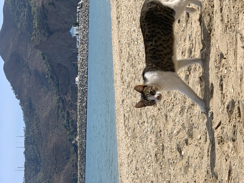 - "A domestic short-haired cat, white with brown and black tabby markings, is captured in mid-stride on a sandy beach in M'diq, Morocco" by FM-db0142, licensed under CC BY 4.0