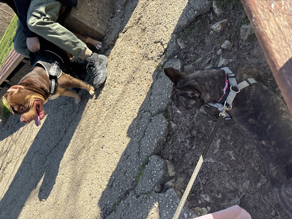 An outdoor scene depicts two dogs and a partially visible individual in what appears to be a park or recreational area in Pleven, Bulgaria. The specific location within Pleven is not identifiable from the visual content. In the upper right, a person is seated on a light brown wooden slatted bench, with only their lower torso and legs visible. They wear olive green cargo pants and dark grey athletic shoes with white soles. Adjacent to the person's right leg, a muscular, brown and tan American Bully-type dog stands, facing left with its mouth open and tongue extended. This dog wears a black vest with "SECURITY" printed in white on its left side. In the foreground, a brindle-patterned French Bulldog-type dog is positioned on a patch of dirt and debris, looking upwards and to the left, likely towards the other dog and person. It wears a grey harness with red accents, to which a light-colored leash is attached, extending out of frame to the lower left. The ground consists of a cracked and uneven asphalt or concrete pathway, with sections of dirt, small rocks, and sparse green vegetation visible in the crevices and lower areas. Strong sunlight from the right casts prominent shadows across the ground and the lower left of the frame. In the background, beyond the bench, a grassy slope is discernible, suggesting a natural or cultivated green space.