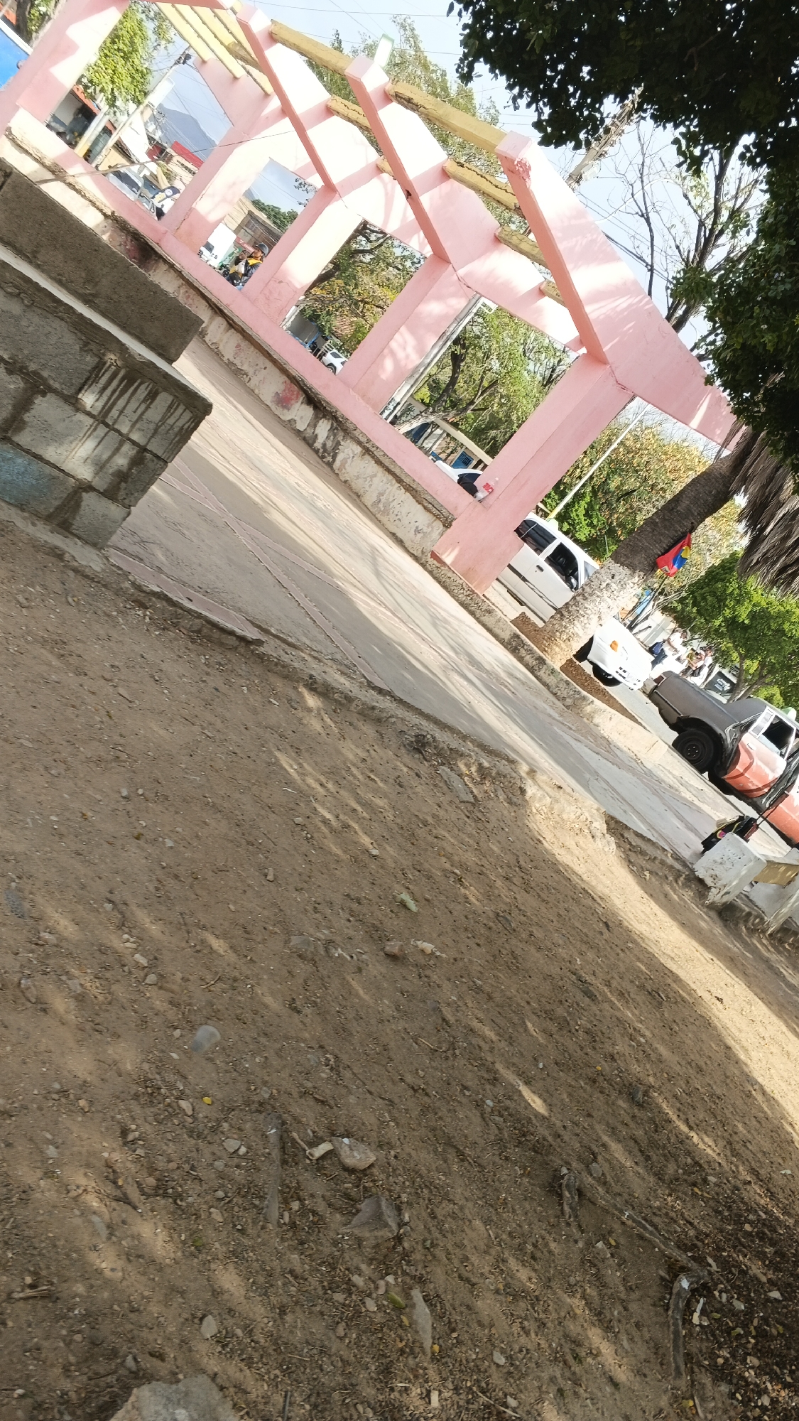 pink archway structure in Juan Griego, Venezuela. The ground in the foreground is dirt and gravel. A concrete walkway leads to the arch. Cars and buildings are visible through the archway. A tree with a Venezuelan flag attached to it stands near the arch.