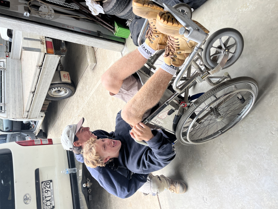 Two young men playfully wrestling in a garage. One carries the other in a fireman's carry. The carried man is in a wheelchair with work boots on his feet. Several vehicles are visible, including a white van with a license plate CXT-92B, a silver truck, and various spare parts and tires. The scene is casually composed with neutral lighting.
