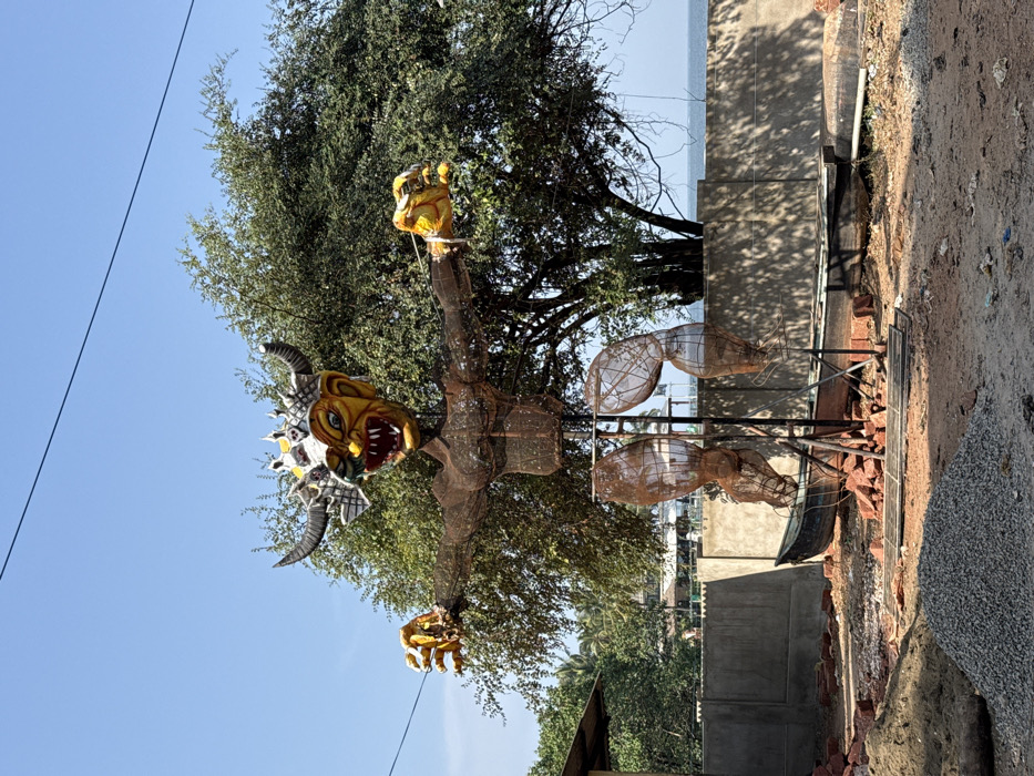 A large, partially constructed effigy stands outdoors, presumably for a festival