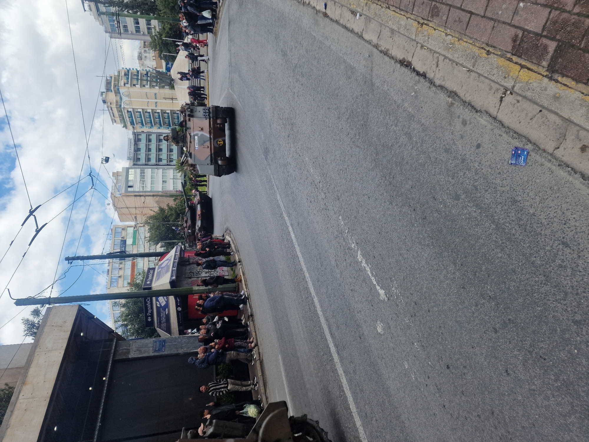 The image depicts a military parade occurring on Achilleos Street in Athens, Greece. The scene is observed from a low-angle perspective at the roadside, looking down a wide asphalt road that curves slightly to the right in the midground, under a partly cloudy sky. In the center of the road, a camouflaged, tracked armored personnel carrier (APC) with the identifier "A0517" and a yellow circular emblem containing the number "11" on its rear is moving away from the viewer. A uniformed soldier is visible from the waist up in the open turret of this vehicle. Further down the street, behind and to the left of the APC, a larger, darker-colored main battle tank or heavy armored vehicle is partially visible, also proceeding in the same direction. The far left foreground shows a portion of the track system of another military vehicle. Along the left side of the street, a crowd of approximately 40 individuals, composed of adults and several children, stands on the sidewalk, observing the parade. They are positioned behind a concrete curb, facing the street. Many individuals are actively watching the vehicles, with some holding mobile phones. Behind the spectators, commercial kiosks displaying "PaysafeCard" logos are present, along with a prominent multi-story concrete building to which a street sign reading "ΟΔΟΣ ΑΧΙΛΛΕΩΣ" (Achilleos Street) is affixed. The road surface is dark asphalt, marked by a faded white broken line. The right side of the road features a concrete curb bordering a paved sidewalk. Overhead utility lines or tram wires crisscross the upper portion of the frame. In the background, numerous multi-story urban buildings, including one identified as "HOTEL APARTMENTS," line both sides of the street. A small blue wrapper is visible on the asphalt near the right curb.