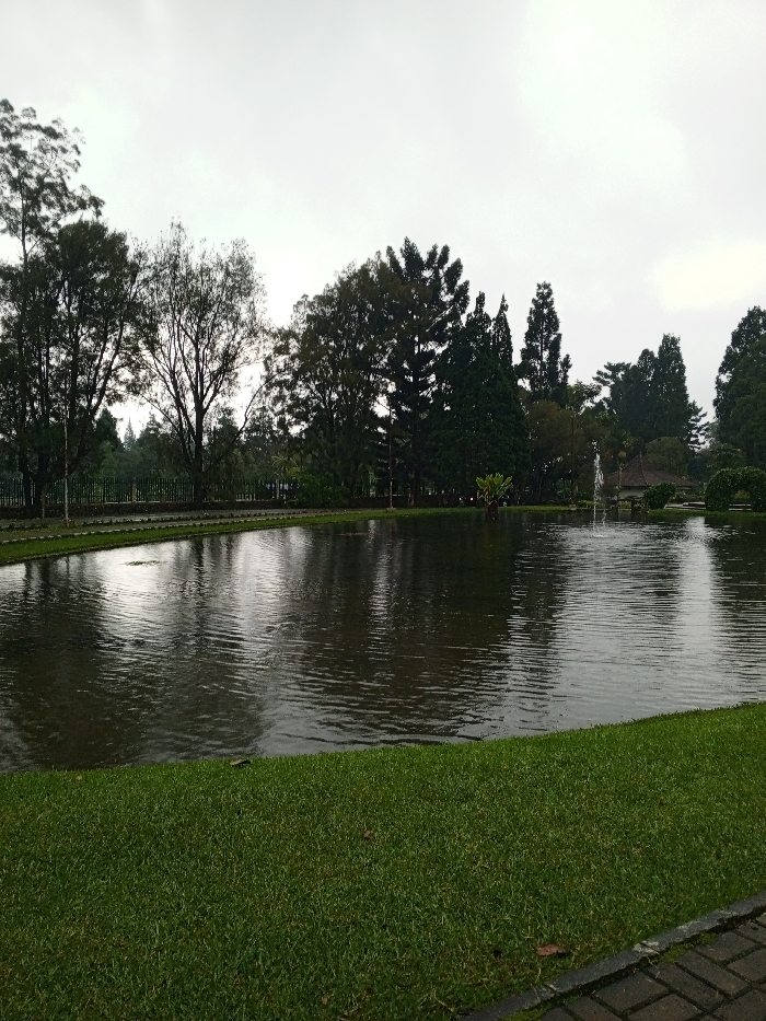A tranquil pond dominates the scene, reflecting a cloudy sky and surrounding greenery