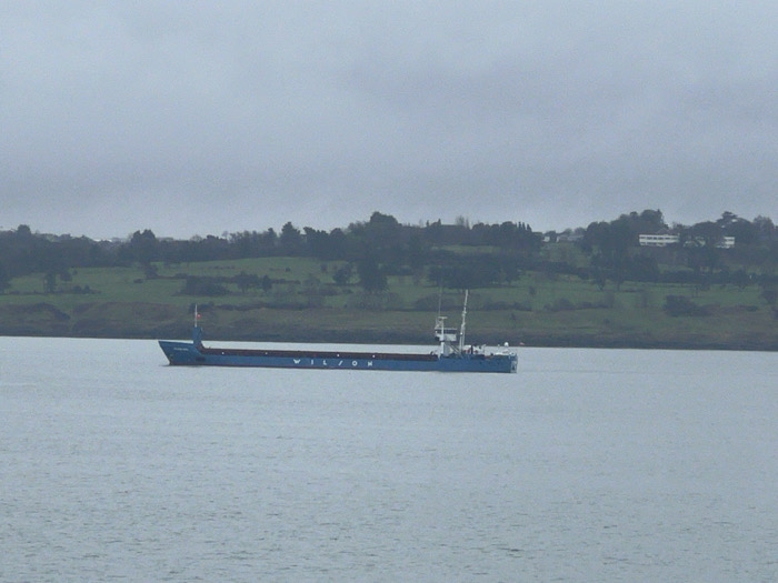The image displays a blue cargo ship transiting a body of water under an overcast sky, with a green, hilly landmass in the background. The location is consistent with the Menai Strait near Bangor, United Kingdom. The central subject is a blue-hulled cargo vessel, likely a general cargo ship, featuring a white superstructure towards its stern. The name "WILSON" is prominently visible in white capital letters along the starboard side of its hull. The ship is oriented with its bow facing left and its stern towards the right, suggesting movement from left to right. There are no visible individuals on board or in the immediate vicinity. The water surface is a uniform grey-blue with minimal ripples, indicating calm conditions. The background features a distant, undulating landmass characterized by extensive green fields and numerous deciduous trees, some in dense clusters and others more scattered. Several light-colored buildings, including a multi-story white structure, are discernible on the distant hillsides amidst the vegetation. The sky above is uniformly light grey, indicating full cloud cover.