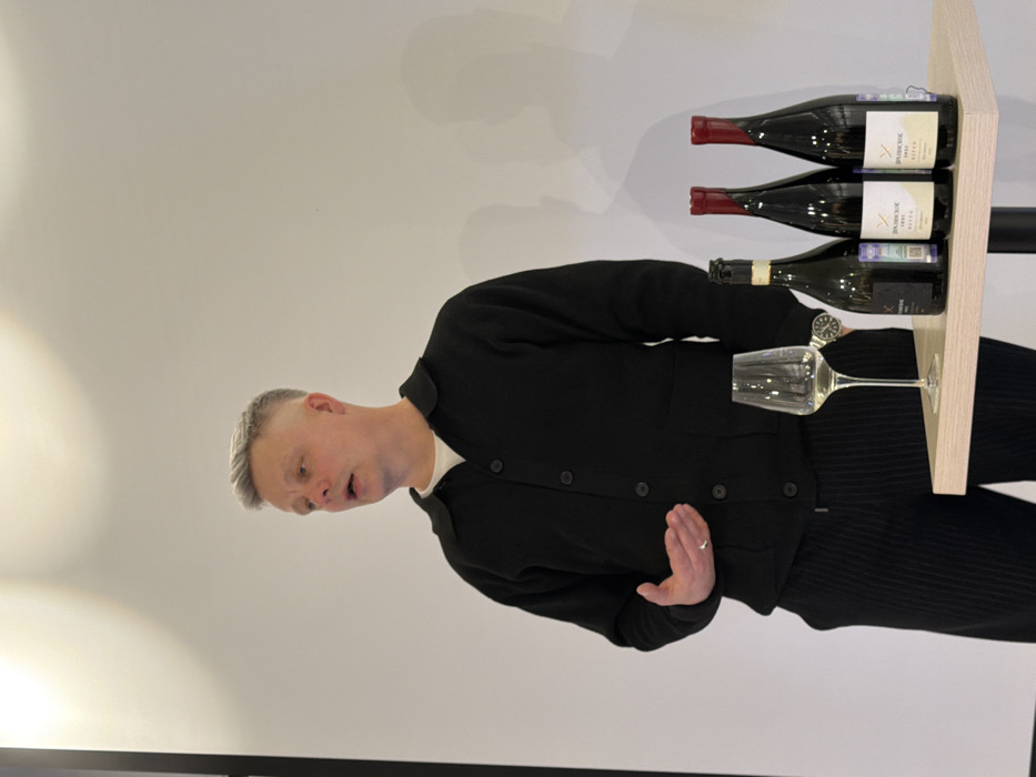 A male individual with short, grey hair and a light complexion stands to the left of the frame, facing slightly right, his mouth open as if speaking or presenting. He wears a black collared button-up jacket over a white undershirt and dark, vertically striped trousers. A ring is visible on his left ring finger, and a watch on his left wrist. His left hand is raised, palm partially open in a gesturing motion. In front of him, on a light-colored rectangular table, an empty clear stemmed wine glass is positioned to the left of four wine bottles. One bottle, appearing lighter in color, is positioned behind the glass. To its right are three dark-colored wine bottles, each with a reddish neck foil and predominantly white labels. Visible Russian text on one label reads "ВИНОДЕЛЬЧЕСКОЕ" and "АЛТАЙ". The background is a plain white wall with soft illumination and faint shadows. The scene depicts a presentation or tasting event, located in Rostov-on-Don, Russia.