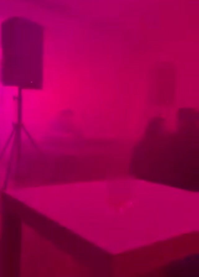 room bathed in red and pink light. A speaker on a stand is visible on the left. There's a white table in the foreground. In the background, blurry figures of people sitting on furniture can be seen. There are also framed pictures on the walls. The camera pans to the right, revealing more seated people and another table.