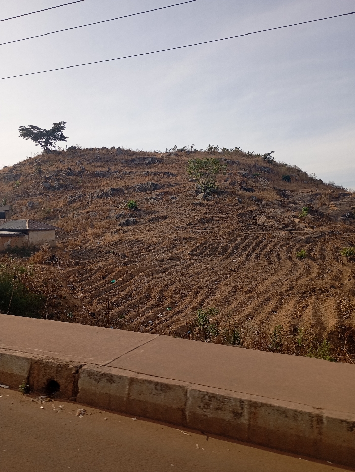 A barren hillside dominates the view, dotted with sparse vegetation and rocky outcrops. Contour lines mark the lower slopes, possibly indicating agricultural terraces. An isolated tree stands silhouetted on the peak. Utility lines stretch across the sky above the hill. A concrete curb runs along the bottom edge of the frame, hinting at a road or path nearby. Overall the scene depicts a dry, arid landscape.