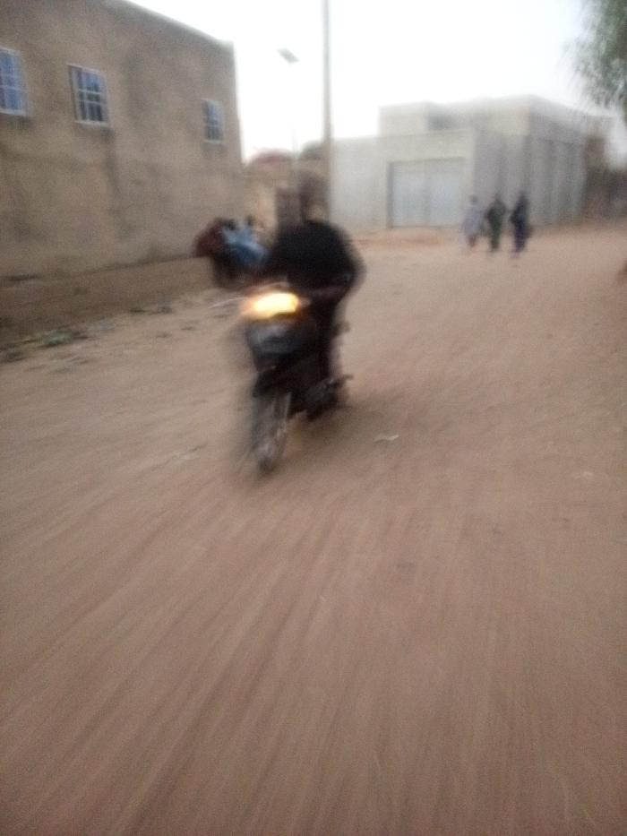 A blurry image captures a person riding a motorcycle on a dusty road in a rural setting. The motorcycle's headlight is visible. To the left, a weathered building with windows stands, while other figures walk in the distance. The road stretches into the distance, creating a sense of movement. The composition is dominated by the brown tones of the road and surrounding structures, emphasizing the rustic environment.