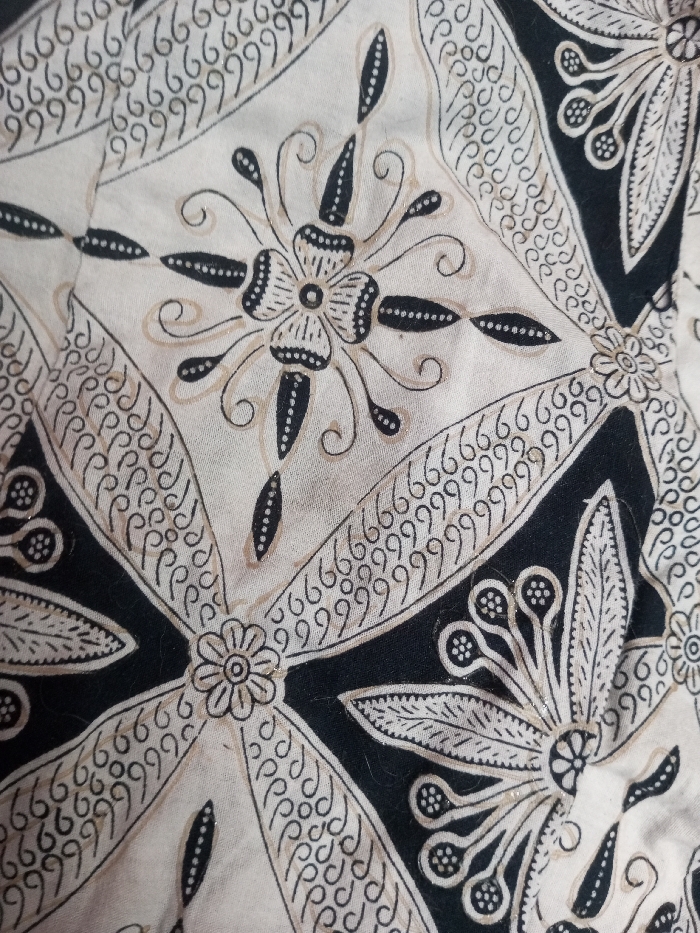 close-up of a fabric with a batik-style pattern. The design features repeating diamond shapes alternating between black and beige backgrounds. Within the diamonds are floral and leaf-like motifs in contrasting colors, with details like dots, curls, and stylized petals. The fabric appears slightly creased and aged.