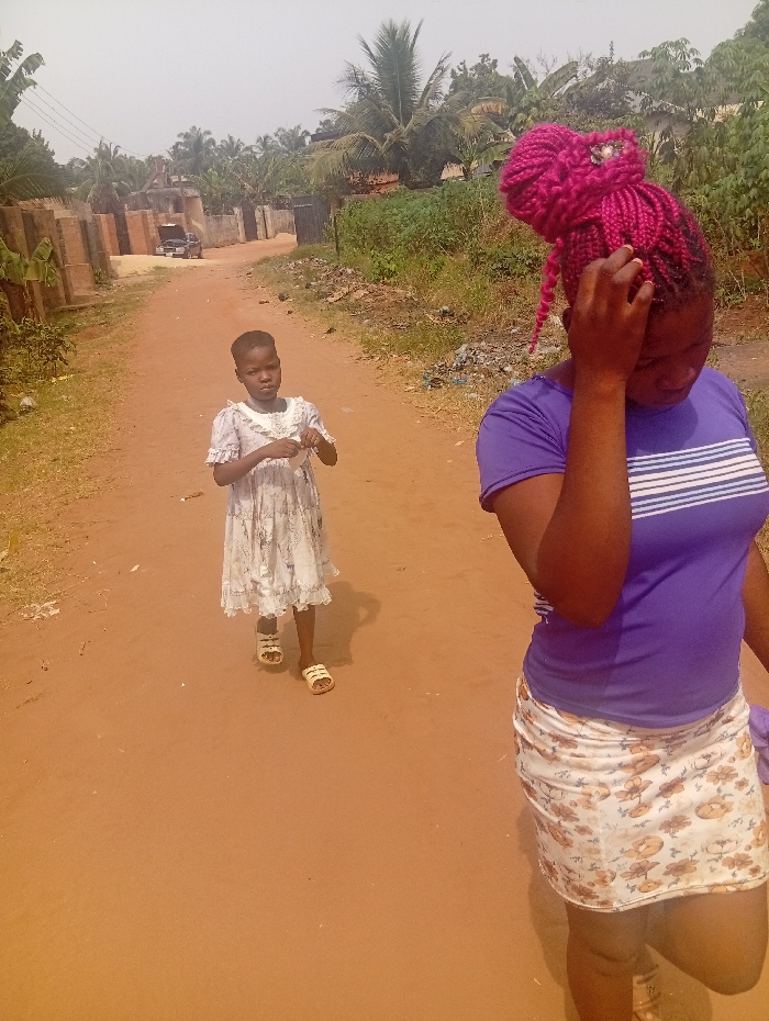 The image captures two individuals on an unpaved reddish-brown dirt road in Umuoji, Nigeria