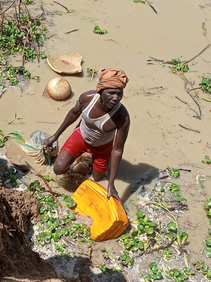 An adult male is observed kneeling in shallow, turbid, brownish-green water in Kokani North, Nigeria