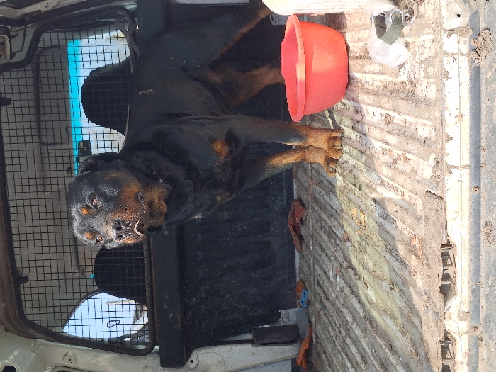 - "A large, black and tan Rottweiler dog stands centered within the dirty, ribbed cargo area of a white utility vehicle under bright daylight" by FM-nmJbp1, licensed under CC BY 4.0