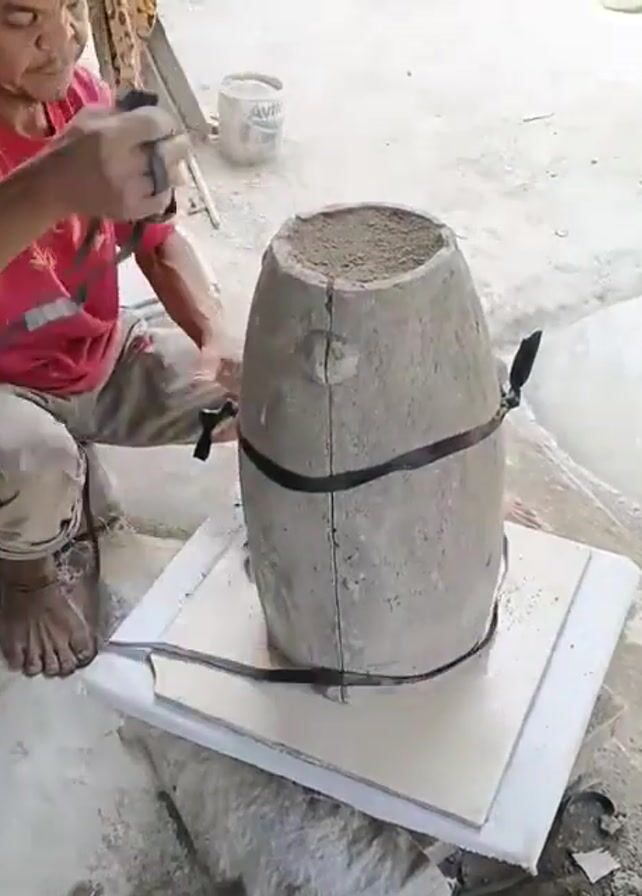 A middle-aged Asian man is shown in this medium shot, sitting barefoot in a squatting position on a concrete floor, next to a vertical, barrel-shaped mold. He is wearing a red t-shirt with a "Volcom" logo and camo-patterned pants. He is securing the mold, which appears to be made of cement or plaster, with black straps, tightening one of the straps with a hand tool. The mold is in two pieces, held together by the straps. It stands on a base made of a tile sitting on a cushioned pad. In the background are other objects, including a bucket, possibly containing cement, and a few potted plants. The scene appears to be outdoors, perhaps in a backyard or workshop.