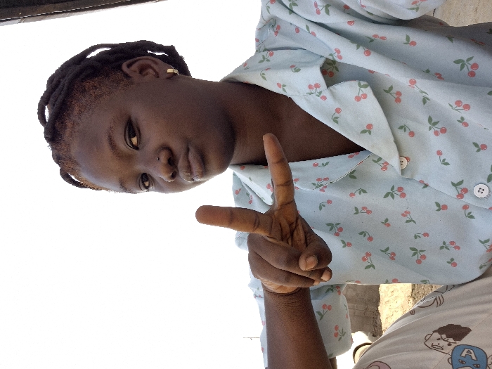 The image displays a young individual with dark skin, sporting braided dreadlocks with reddish-brown coloring at the roots and shaved or faded sides