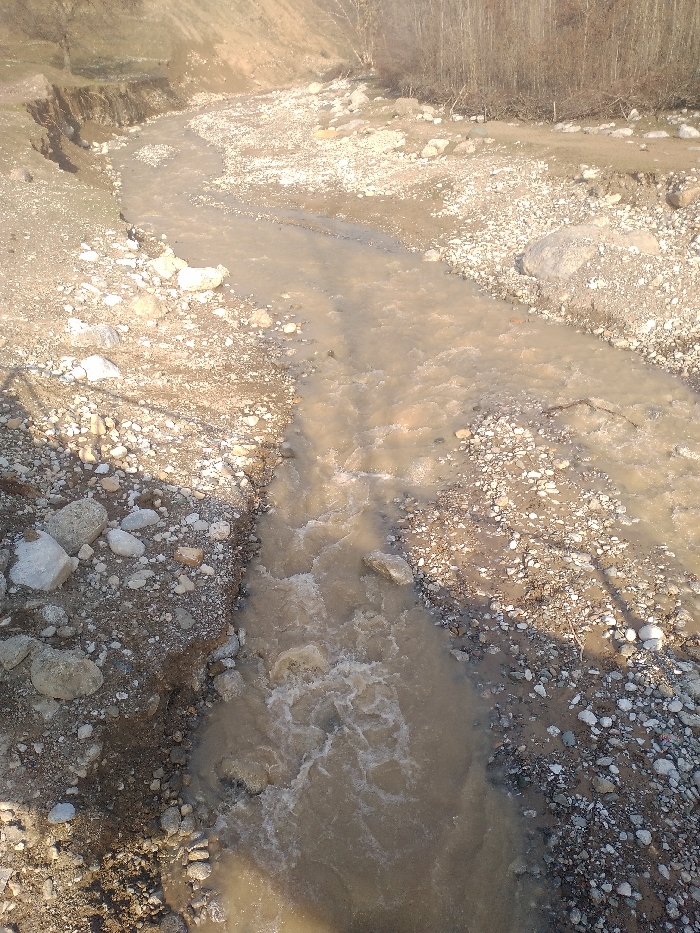 The image depicts a flowing, muddy river or stream in a rural or wilderness setting. The water, a light brown hue, courses over a bed of varying-sized light-colored gravel, pebbles, and larger rocks. The banks on both sides are composed of similar rocky and sandy soil, with evidence of erosion, particularly on the left bank where a steep, cut bank reveals stratified earth. In the background, a steep, treeless hillside rises on the left. On the right, a denser cluster of bare trees or shrubs with thin trunks lines the riverbank, suggesting deciduous vegetation in a dormant state. Scattered detritus, including branches, is visible along the banks. No individuals or man-made structures are present within the frame. The scene is illuminated by natural light, casting subtle shadows from an unseen object on the lower right bank. The overall environment appears rugged and natural.