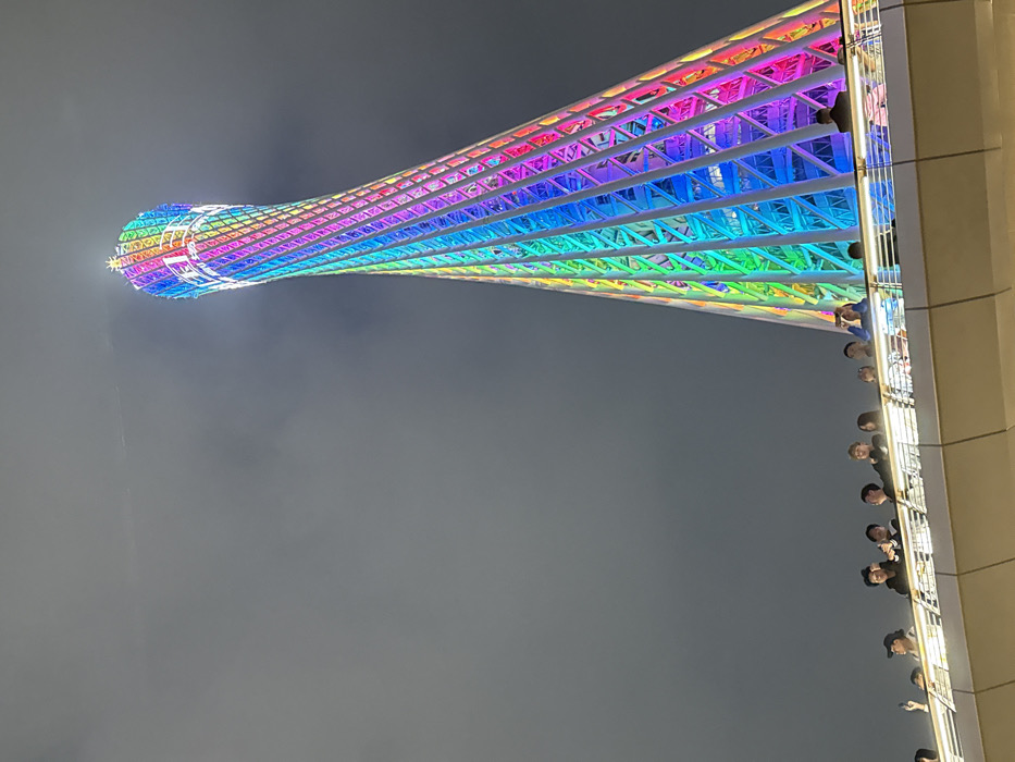 A nighttime photograph depicts the Guangzhou Tower, a prominent landmark in Guangzhou, China, illuminated against a dark, overcast sky. The tower, a tall, slender structure with a visible lattice framework, is bathed in a vibrant, multi-colored light display, exhibiting a gradient from red and orange at its base through yellow, green, and blue, to indigo and violet near its apex. The very top of the tower glows intensely. In the lower foreground, an elevated pedestrian bridge or viewing platform features a group of approximately fifteen to twenty individuals. These individuals are primarily positioned along the railing, observing the illuminated tower. Several people are holding smartphones up, consistent with taking photographs or videos. The structure they stand on appears to be concrete with a metal railing. The scene is located in the vicinity of Tianhe District, offering a clear view of the iconic tower.