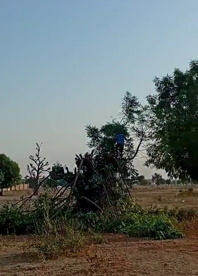 man climbing around in a large pile of cut tree branches. The area appears to be rural, with a dirt road in the foreground and a field visible in the background. There are a few trees and some scattered buildings in the distance. The sky is light blue. The man in the tree pile is wearing a blue shirt.