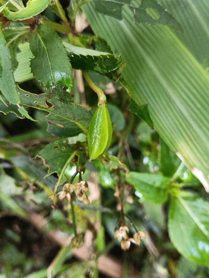 A vibrant green, oblong fruit hangs amidst a tangle of foliage. Leaves display signs of insect damage with chewed edges and small holes. Below the fruit, withered flowers dangle on thin stems. A large, broad leaf with distinct ridges occupies the upper right, contrasting with the smaller, shiny green leaves surrounding the central fruit. The background is a blur of green and brown.