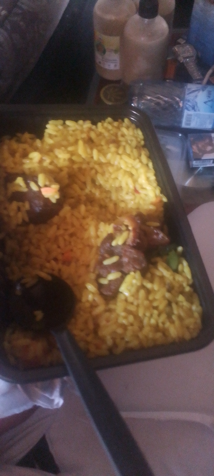 Yellow rice fills a black tray, interspersed with pieces of meat and a few green vegetables. A spoon rests in the rice, and several bottled items, including what appears to be lotion, are visible near the tray, along with a small box or two. The background suggests a casual setting.