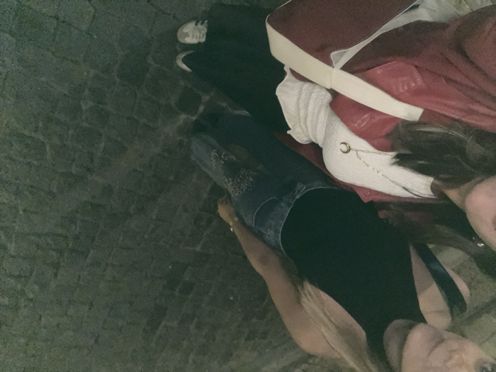 The scene depicts two individuals standing on a dark cobblestone pavement in Lisbon, Portugal, under low light conditions, suggesting evening or night. The perspective is an elevated, downward-looking shot, likely a selfie. Subject 1, on the right, is a female with long blonde hair, partially visible. She wears a black sleeveless halter-neck top and blue denim jeans featuring light-colored embroidery or patterns on the upper thigh area. A gold bracelet is visible on her left wrist. Subject 2, positioned closer to the camera and partially overlapping Subject 1, is a female with dark hair, also partially visible. She wears a white, ribbed, long-sleeved top and a red leather-like jacket draped over her shoulders. A gold-toned necklace with a crescent-shaped pendant hangs over her white top. She has dark pants or a skirt and is wearing white sneakers on her feet. A wide, off-white strap, possibly from a bag or garment, crosses her torso diagonally from left to right. The ground is uniformly paved with dark, irregular cobblestones, typical of Portuguese pavements. No other architectural features or objects are clearly discernible in the immediate background.