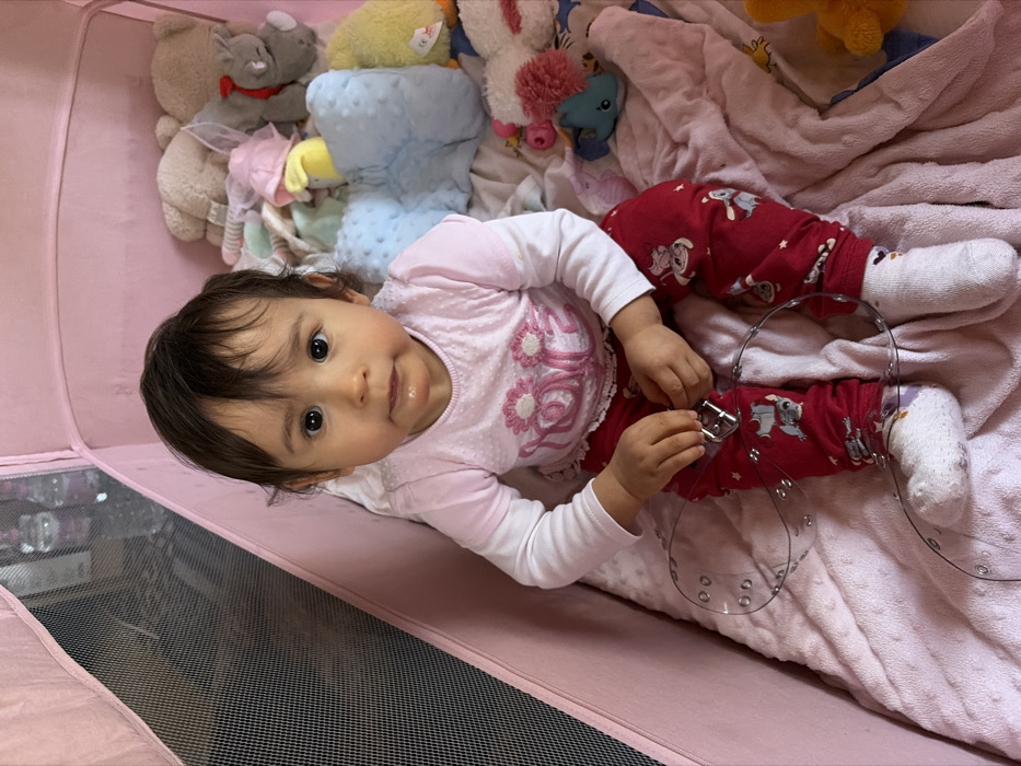 A young child, appearing to be a baby or toddler with dark hair and eyes, is depicted sitting upright inside a pink fabric playpen or portable crib