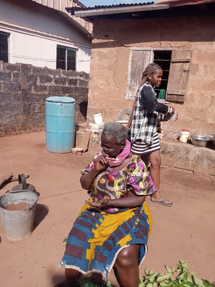 The scene depicts an outdoor residential area in Okpatu-Ukehe, Nigeria, under bright daylight. Two females are present on unpaved earthen ground. In the foreground, an older woman with grey hair and dark skin is seated, wearing a colorful patterned top, a blue and yellow patterned wrap skirt, and a pink scarf around her neck. She holds her right hand near her mouth, seemingly chewing or examining something, with her left hand open in her lap. A pile of green leafy plants is positioned on the ground near her feet. To her left, a metallic bucket filled with brown material and a black lidded container are on the ground. In the mid-ground, a younger woman with long braided hair stands in front of a rustic, single-story building featuring reddish-brown textured walls and a corrugated metal roof overhang. She wears a black long-sleeved shirt over a plaid top and a striped skirt, with dark flip-flops on her feet. She holds a white plastic cup or small container in her right hand near an open, weathered wooden window of the building. Various kitchen items, including a metal bowl and a red-lidded jar, are visible on a raised ledge outside this building. In the background, to the left of the rustic building, a blue plastic barrel with a lid stands next to a low, dark grey concrete block wall. Behind this wall, a portion of a lighter-colored, more modern building with glass windows is visible.