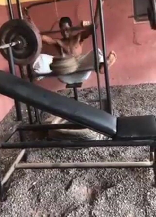 A man is exercising at an outdoor gym. He is sitting on a makeshift bench, wearing light-colored pants and no shirt. He is pulling down on a bar connected to a pulley system. The weight attached to the pulley includes what appear to be car parts. The gym equipment, including the bench and pulley system, appears to be homemade, likely assembled from scrap metal and tires. The gym area is covered in small gray gravel. The walls are painted red and yellow. Another person briefly enters the frame, walking past.