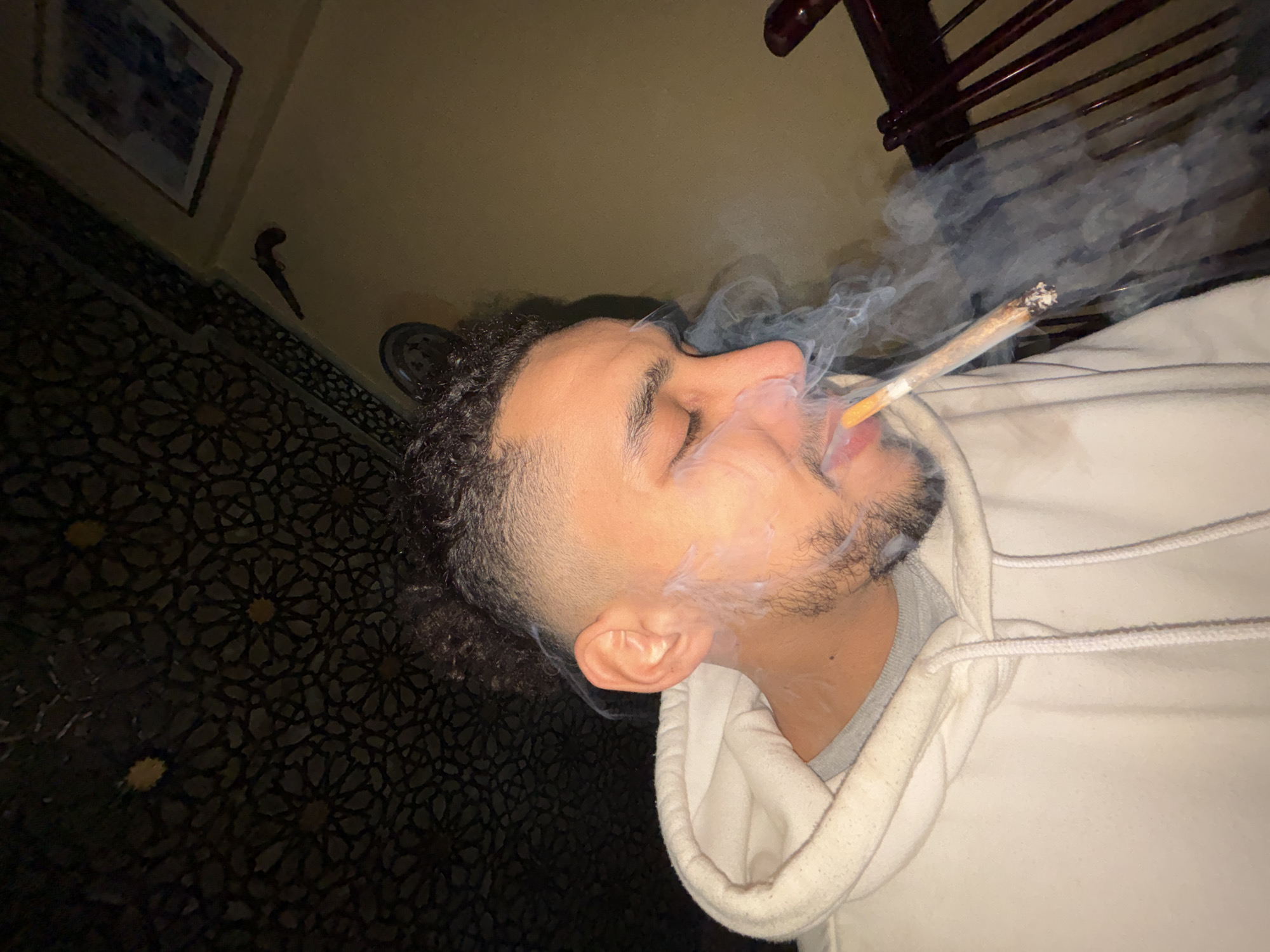 A man is shown in a tilted portrait view, smoking a cigarette or similar rolled item with white smoke billowing around his face. He wears a white hoodie over a gray shirt. The background shows a wall with patterned tile work. A framed picture hangs on the wall. The image was potentially taken in Tanger, Morocco.