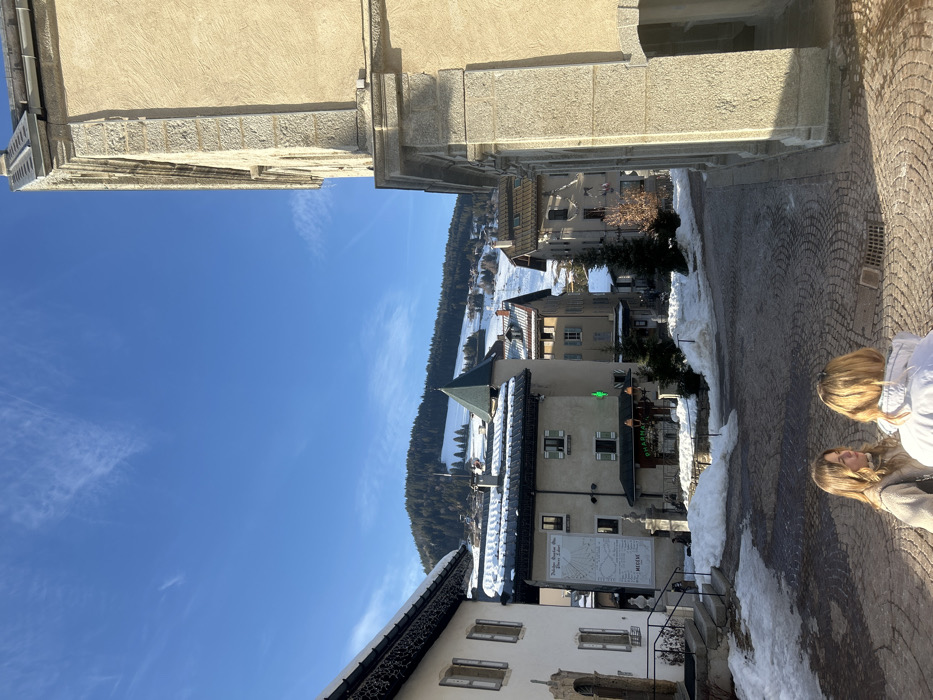 A picturesque village scene unfolds on a sunny day. Buildings are covered in snow, nestled against a backdrop of a forest-lined lake and clear blue sky. A cobblestone street lined with snow drifts leads to a building with a sundial on its wall. Two people are visible in the foreground, likely tourists. The perspective is from an elevated position, possibly a building's terrace.