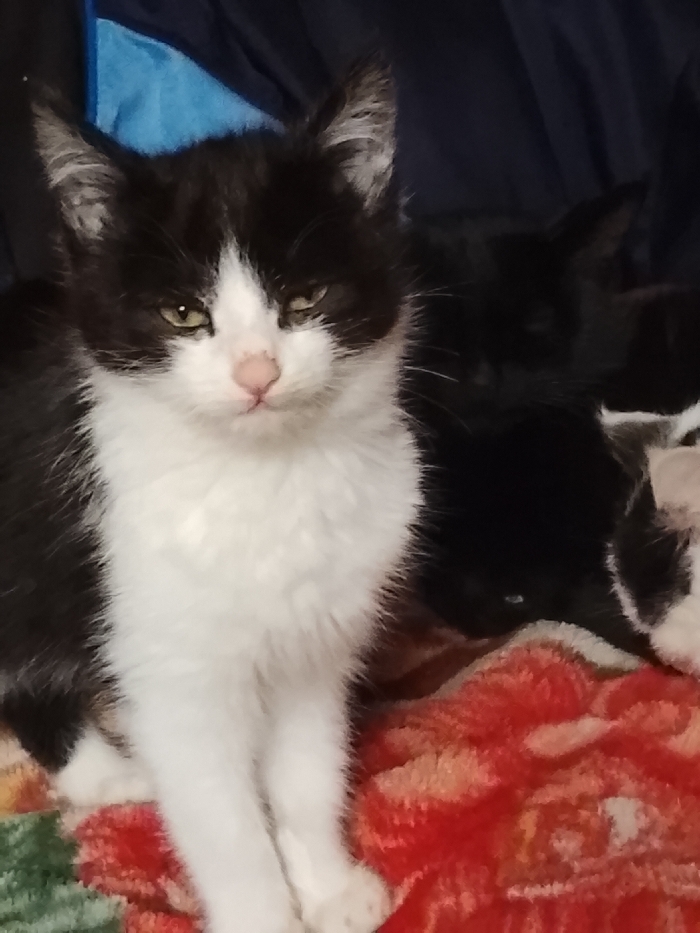 This image depicts a group of kittens resting on a patterned textile surface, set in the city of Qoraqosh, Uzbekistan. In the foreground, a black and white kitten is positioned centrally, facing directly towards the viewer. This kitten exhibits white fur on its chest, front paws, and a blaze extending from its pink nose up between its eyes, which are partially open and display a yellowish-green hue. The rest of its visible fur, including its ears, the top of its head, and its back, is black. The kitten appears young. To the right and slightly behind the central kitten, a second, predominantly black kitten is visible, partially obscured by shadow. Its head is distinguishable, with one light-colored eye faintly discernible. Further to the right and lower, the head of a third kitten, appearing to be black and white, is partially visible, primarily obscured by the black kitten and the red textile. The kittens are resting on a thick, soft textile or blanket that features a dominant red color with interwoven patterns in orange, yellow, and green. This textile occupies the lower half of the frame. The background consists of a dark blue fabric or surface, with a lighter blue segment visible in the upper left portion of the image. The overall lighting is dim. No human figures are present. The kittens appear to be in a state of rest.