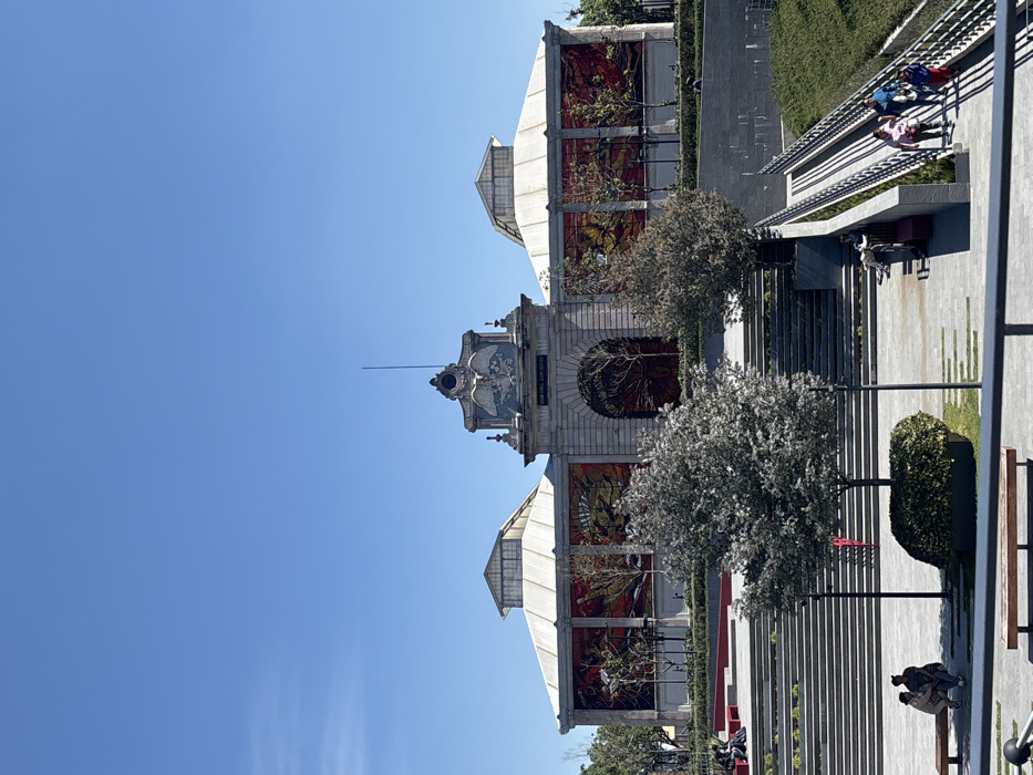 A stone structure with a clock tower stands between two buildings, each featuring decorative windows. Trees flank the path leading up to the structure. The path includes stairs and a landscaped garden with benches. People sit along the path enjoying the view. The sky is blue and clear.