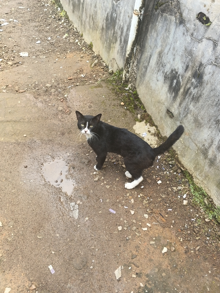 - "A black and white domestic cat stands on an unpaved dirt and gravel surface in Bien Hoa, Vietnam" by FM-cuX0C2, licensed under CC BY 4.0