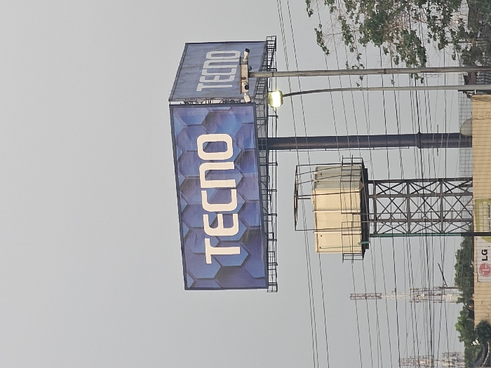 The scene depicts an outdoor environment in the city of Unknown, Unknown. A large, double-sided billboard centrally displays the word "TECNO" in white capital letters against a blue background with a hexagonal pattern. This billboard is mounted on a tall, dark cylindrical pole. To the left of the billboard's main support, a rectangular, light-colored utility tank rests atop a metal lattice tower. A streetlight with an illuminated fixture stands to the right of the billboard pole. Multiple dark utility lines traverse the mid-ground horizontally. In the distant background, several lattice communication or electrical towers are partially visible. The lower foreground features a light-colored wall, with a partial red "LG" logo visible on a banner below it, alongside sparse green foliage. The sky is uniformly light gray, indicative of overcast conditions. No persons or dynamic activities are observed within the frame.