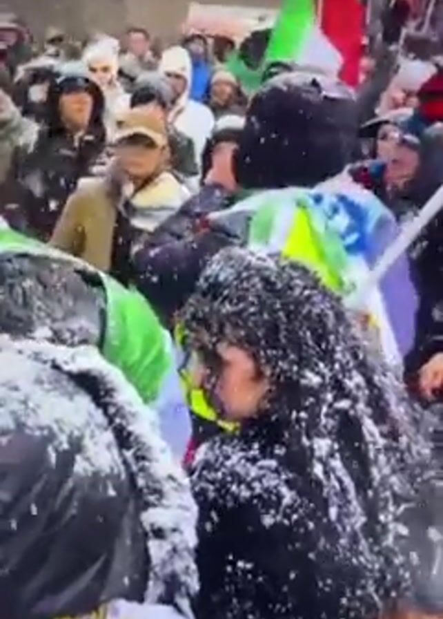 group of people protesting in a snowy environment. Many people are wearing winter clothing and hats, and several are carrying flags. The flags appear to have the colors green, white, and red. The protesters are crowded together, and some are shouting. Snow is falling heavily and accumulating on the protesters and their clothing. The overall impression is one of a politically charged gathering taking place in challenging weather conditions.